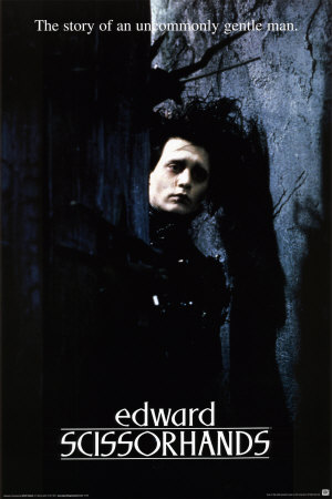 אדוארד ידי מספריים (ג'וני דפ) וקים בוגס (וינונה ריידר) מתחבקים בביתם בשעה שהוא נרדף על ידי ההמון הזועם.